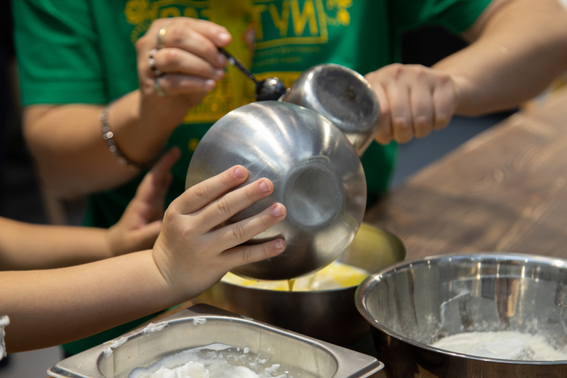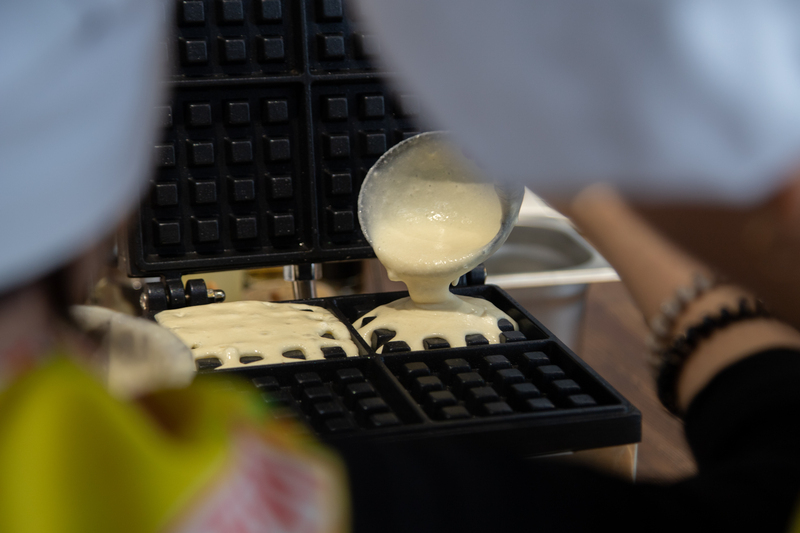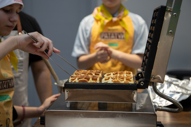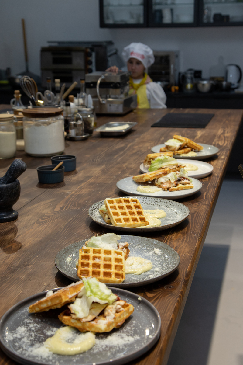 После творческого вдохновения дети с удовольствием перешли к кулинарному мастер-классу в студию «Арт-шеф». Под руководством шеф-повара Четверикова Владимира дети научились готовить салат «Цезарь» с настоящей ресторанной подачей, пекли восхитительные венские вафли и даже готовили соленую карамель, которую забрали с собой, чтобы угостить своих друзей!